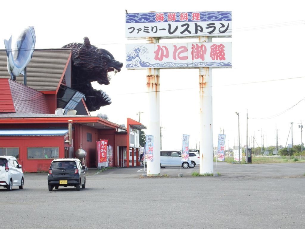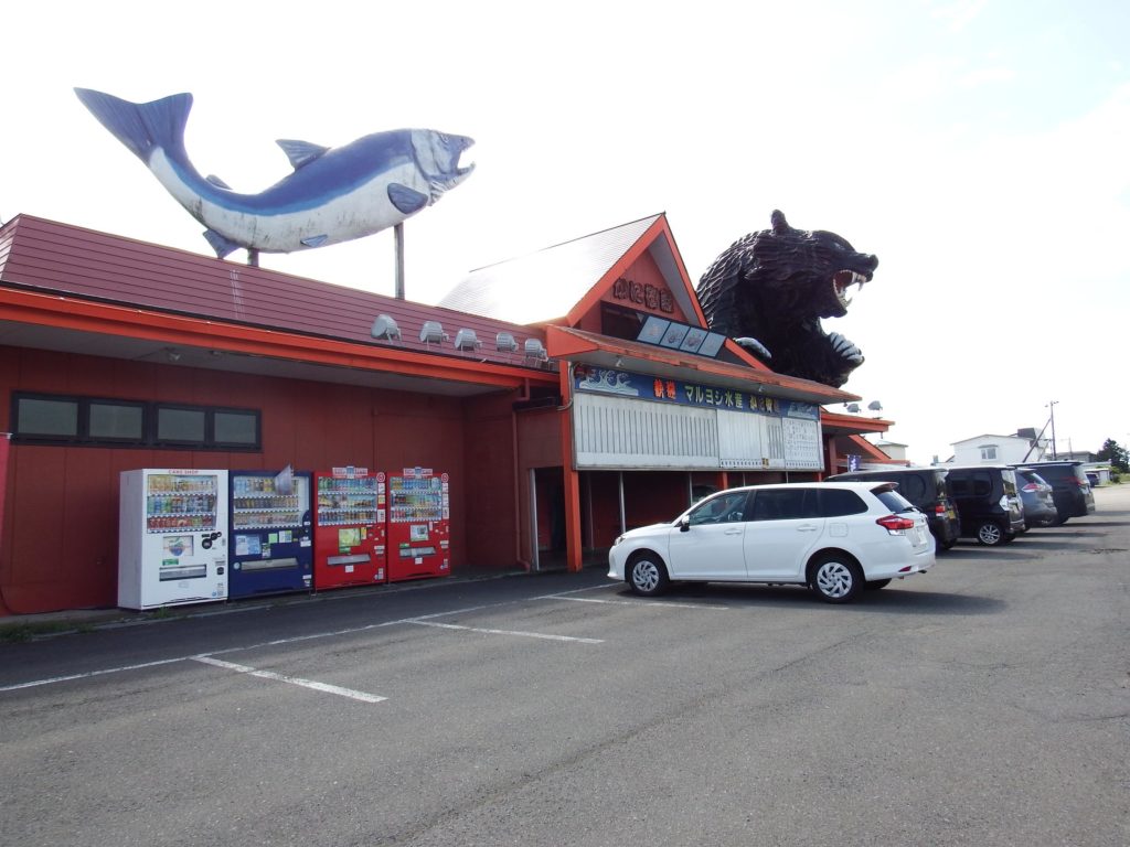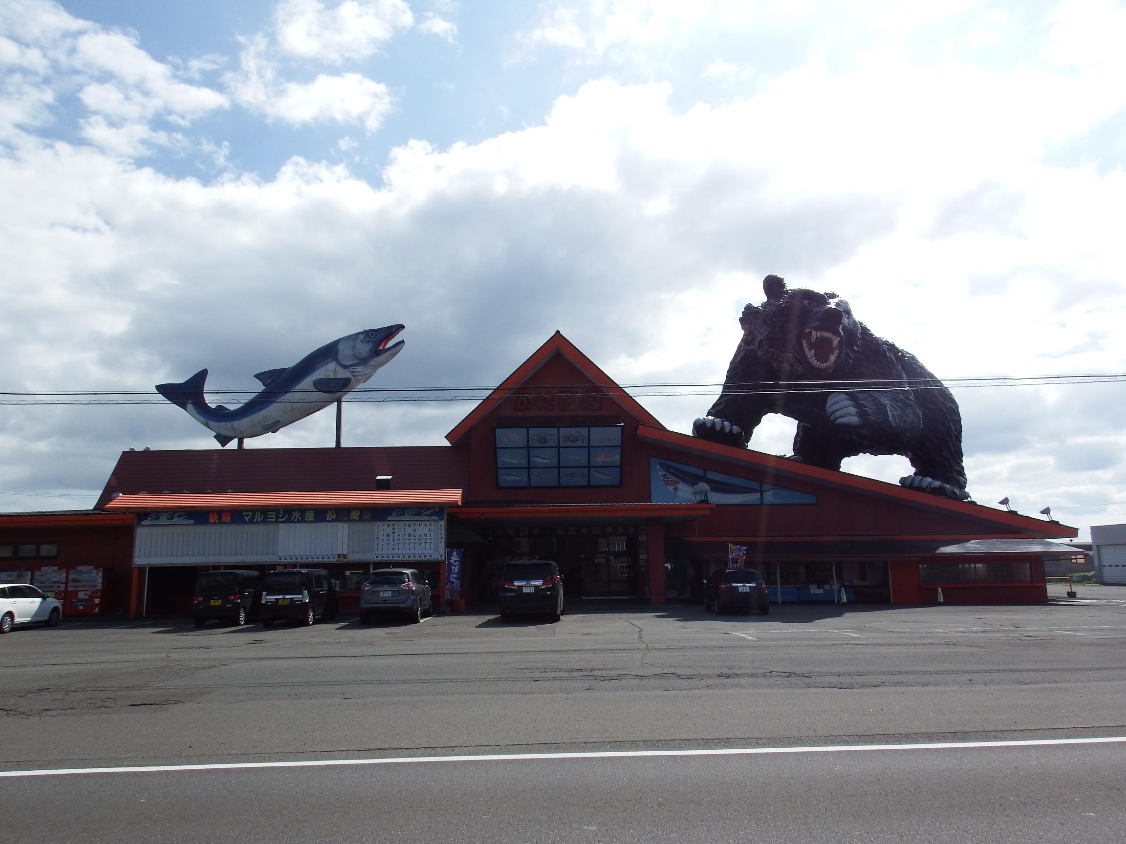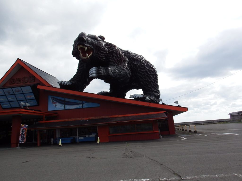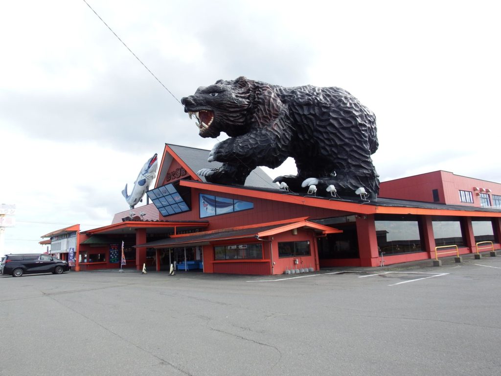 思わずハンドルを切ってでかい熊と鮭の店の前に停まり、絶句。