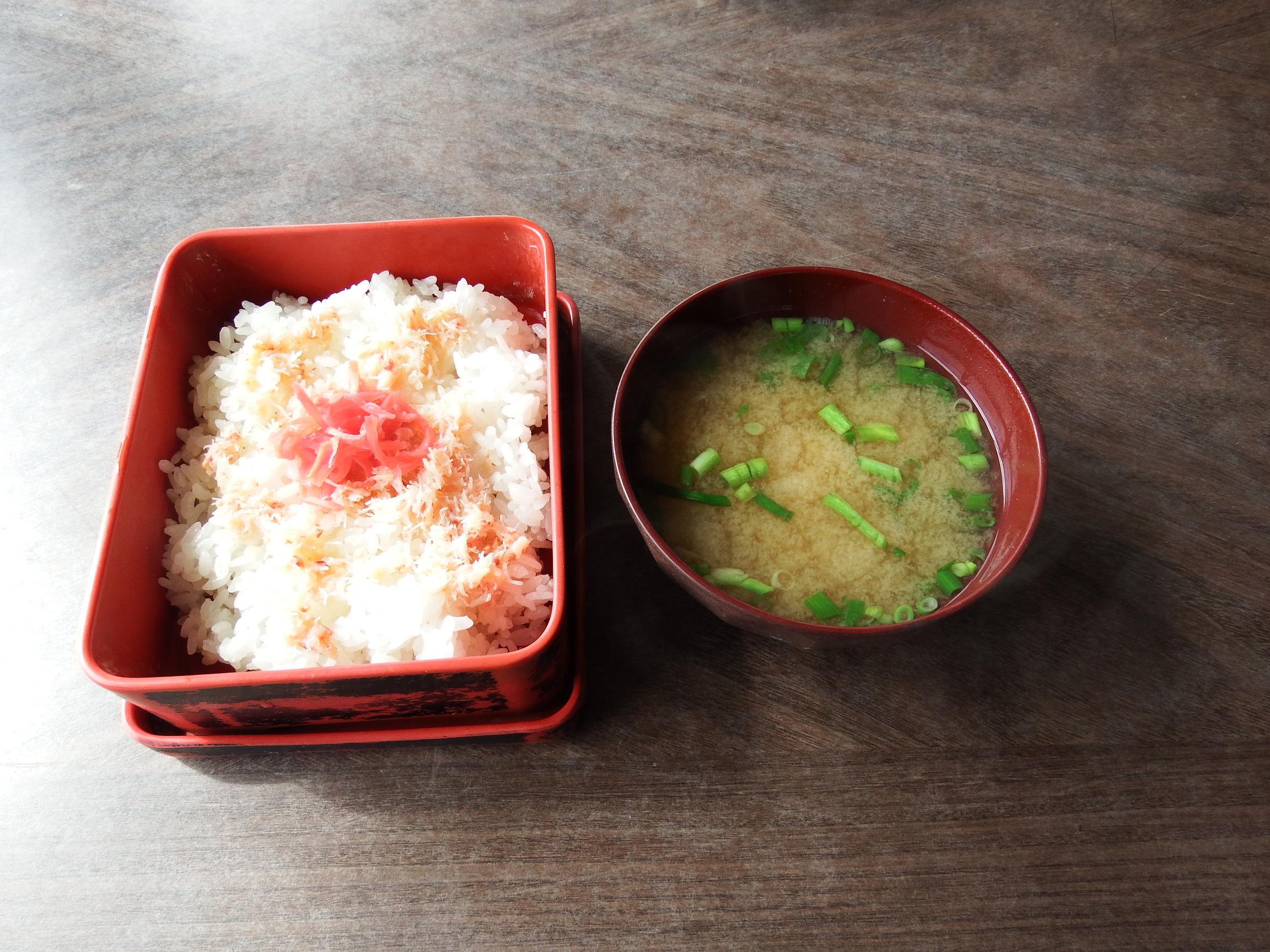 するとすこしして、大将がお盆にのせたかに飯を持ってきてくれました。味噌汁付き!