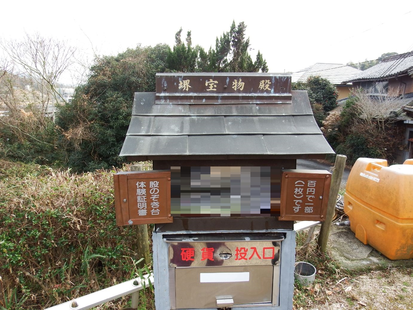 妙に低いお立ち台と【堺宝物殿】と書かれたステンレスの硬貨投入口がついた観音開きの祠。扉には『百円を入れましたか ・・・・ハイ では開けてください』という高圧的な文言が。
