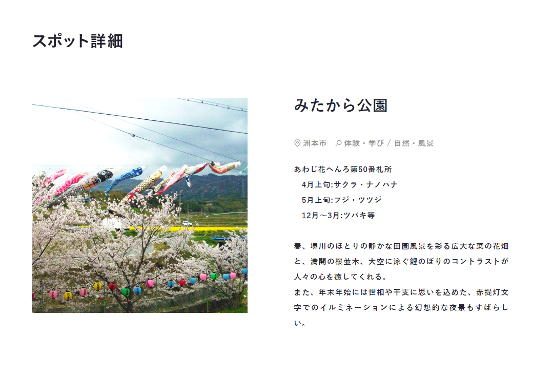 こいのぼりと写真一枚。なんともシンプル。あわじ花へんろの第50番札所でもあり、見ごろの花の紹介もあります。以上。